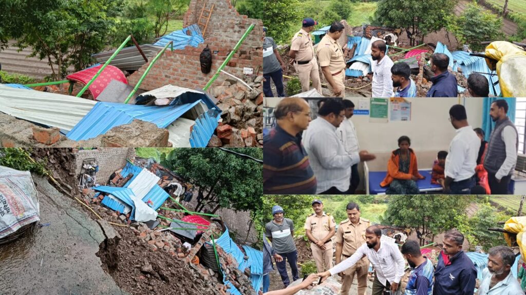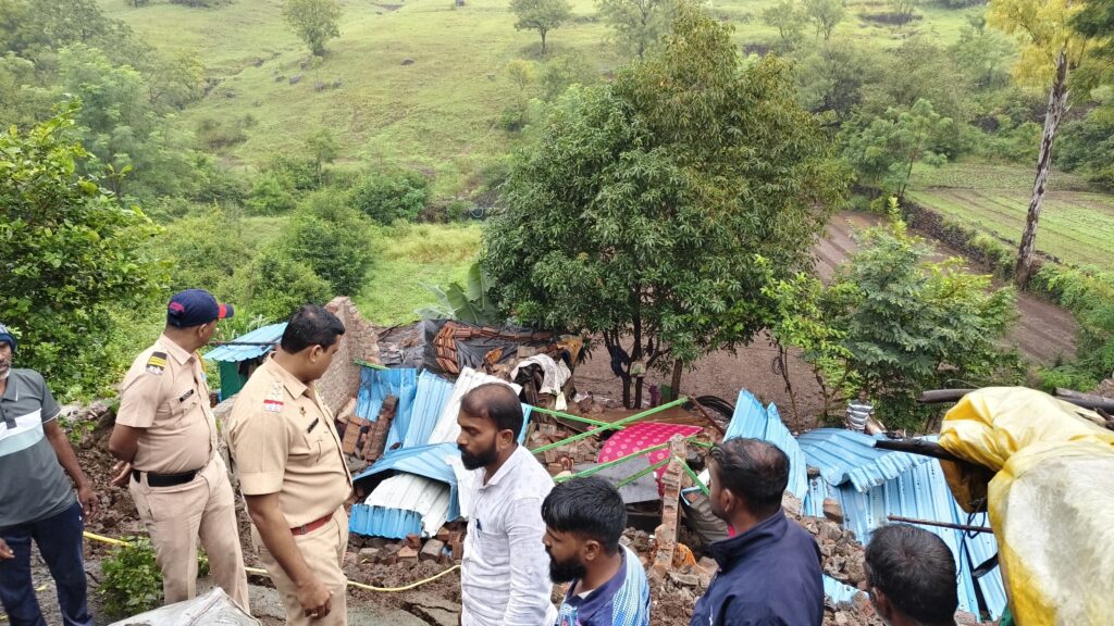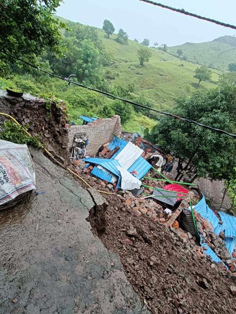 पुणे जिल्ह्यात ठीक ठिकाणी मध्यरात्रीपासून संततधार पाऊस चालू असल्याने आंबेगाव तालुक्यातील मौजे पहाडदारा येथील ठाकरवस्ती या ठिकाणी सकाळी नऊ ते दहा वाजायचे सुमारास बबन सखाराम कडाळे, बायजाबाई बबन कडाळे, रवींद्र बबन कडाळे व आरती बबन कडाळे यांचे राहते घर हे अतिवृष्टीमुळे जमीन खचून पडल्याची घटना घडली आहे.