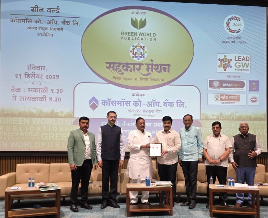 ग्रीन वर्ल्ड पब्लिकेशन, पुणे व कॉसमॉस सहकारी बँक, पुणे यांनी संयुक्त विद्यमाने जागतिक सहकार वर्षाचे औचित्य साधून सहकार व्यवस्थेतील अनुभवांचे आदानप्रदान, विचारमंथन व धोरणात्मक संकल्पनावर चर्चा करण्यासाठी “सहकार मंथन २०२५” कार्यक्रम रविवार (दि. २१ डिसेंबर) आयोजित करून कार्यक्रमामध्ये कारखान्यास “ग्रीन वर्ल्ड को प्राईड २०२५” पुरस्कार प्रदान करण्यात आला. यावेळी महाराष्ट्र राज्य सहकारी बँकेचे प्रशासक डॉ. विद्याधर अनास्कर, महाराष्ट्र राज्याचे साखर आयुक्त संजय कोलते, कॉसमॉस सहकारी बँकेचे अध्यक्ष प्रल्हाद कोकरे, ग्रीन वर्ल्ड पब्लिकेशनचे चेअरमन गौतम कोतवाल तसेच साखर उद्योगातील अनेक मान्यवर उपस्थित होते.